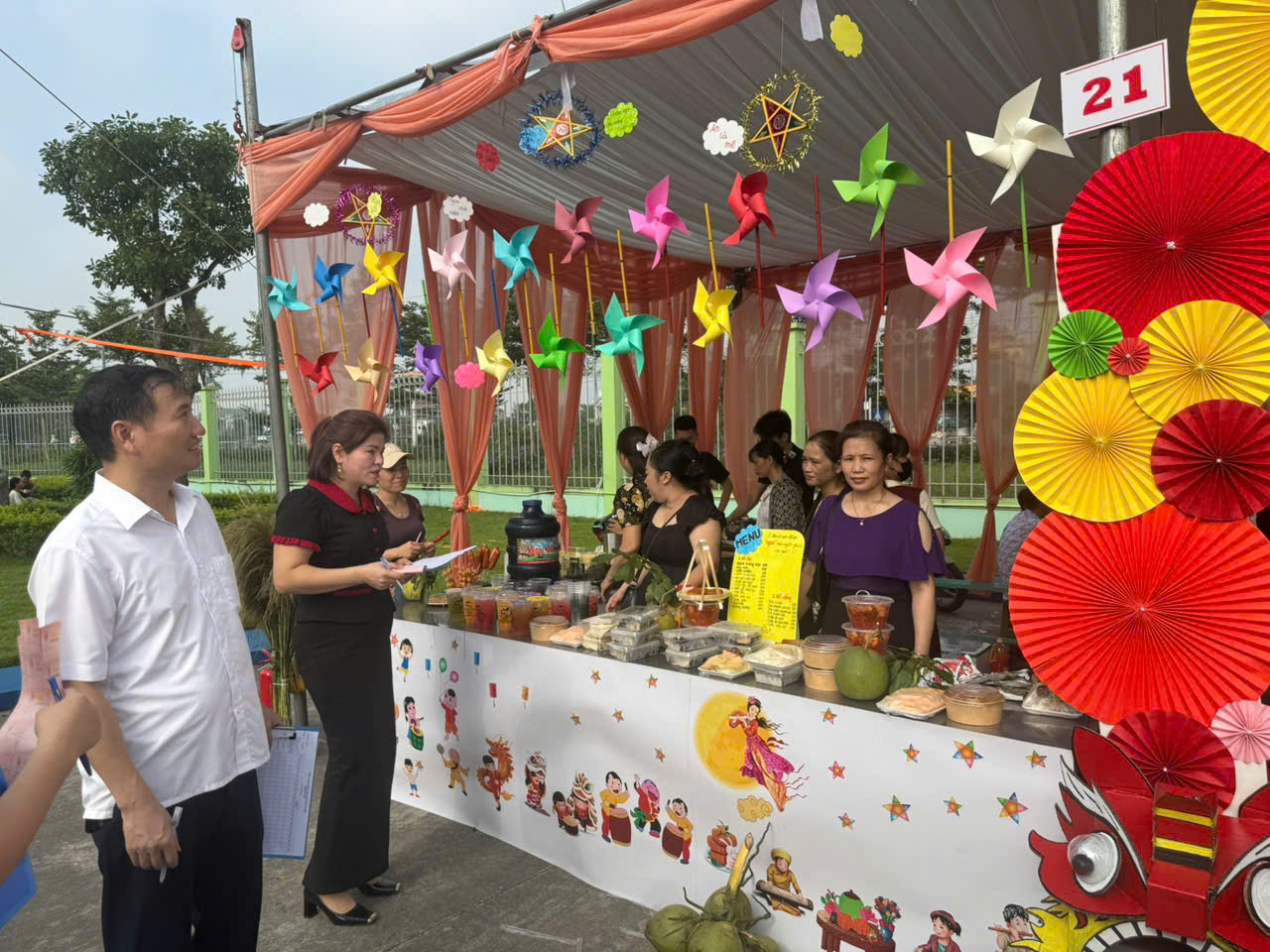 Hội chợ quy tụ 22 gian hàng, mỗi gian đều được các tổ, bộ phận người lao động chăm chút trang trí rực rỡ, tràn đầy sáng tạo. Các gian hàng bày bán nhiều món ăn ngon, đồ uống mát lành và vật dụng thiết thực, thể hiện tinh thần đoàn kết, khéo léo, gắn bó của tập thể cán bộ, công nhân viên.